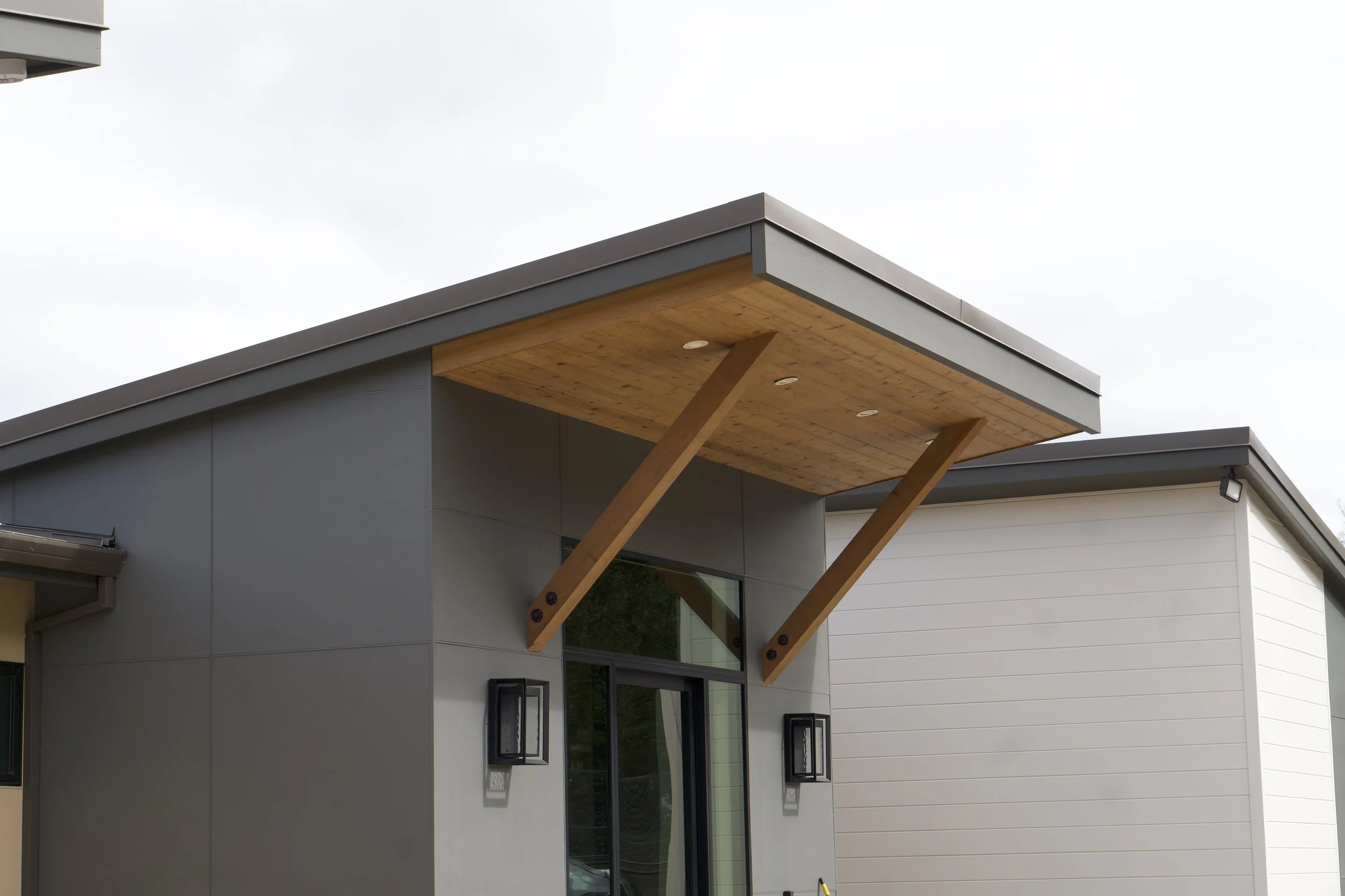 Structural systems are carefully coordinated to support both performance and architectural intent. A waterproofed deck over the lower living area is framed with LVL joists and sloped to direct drainage, while front and rear bracing elements reinforce the roof structure and contribute to the home’s visual rhythm. Lateral resistance is achieved through plywood shear walls beneath lap siding, with a stone-clad base anchoring the front elevation, resulting in a durable, well-balanced system that integrates seamlessly with the site.