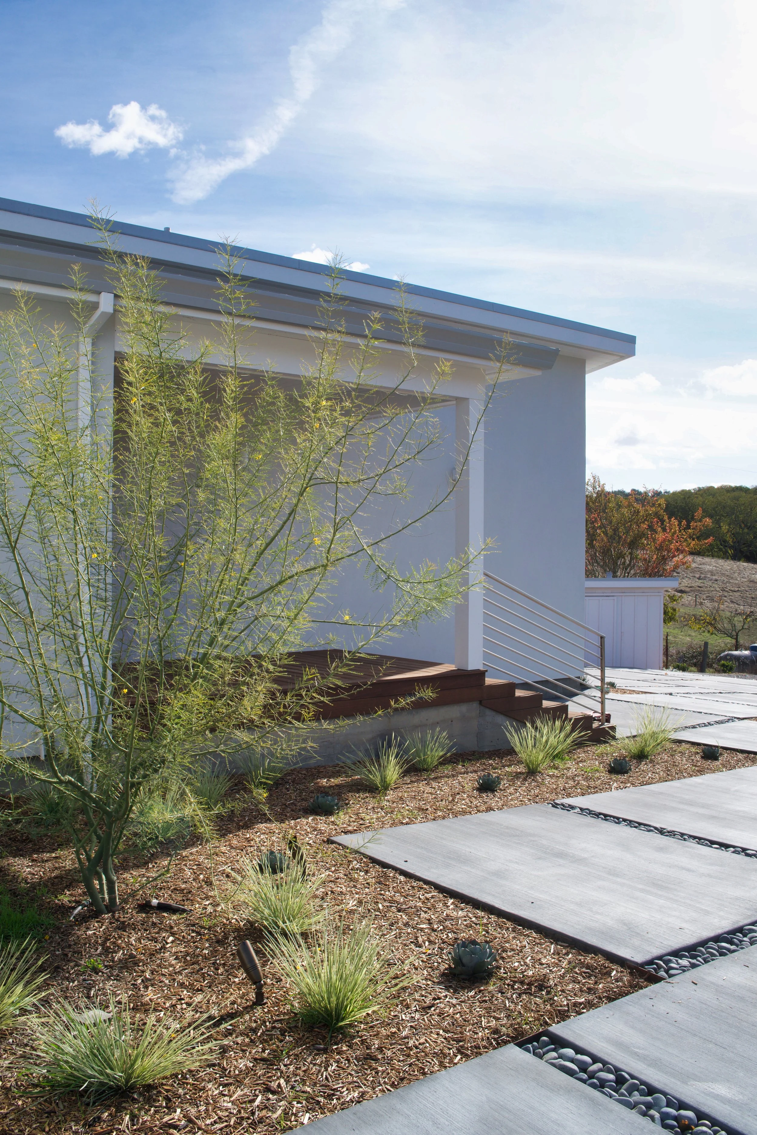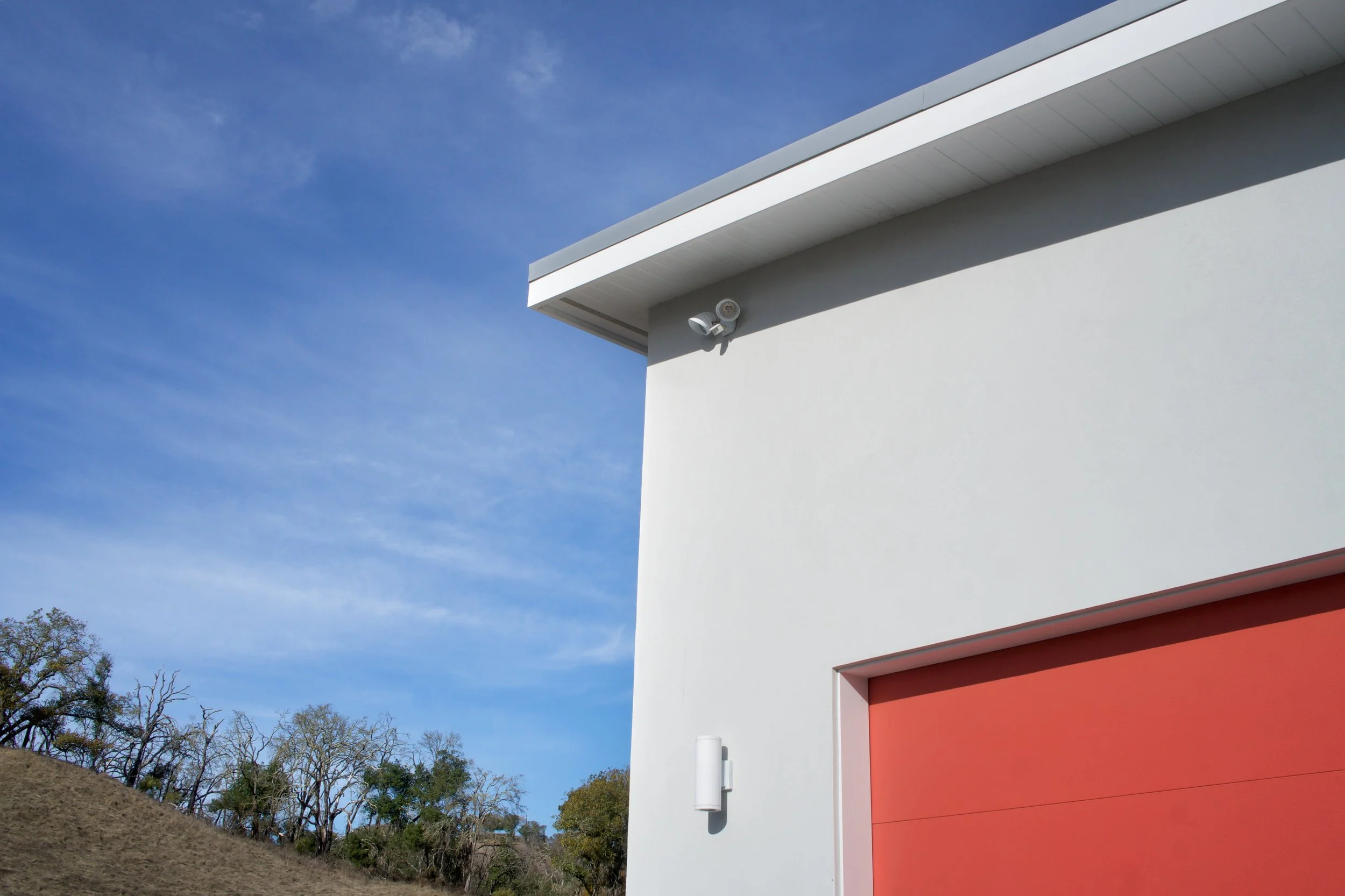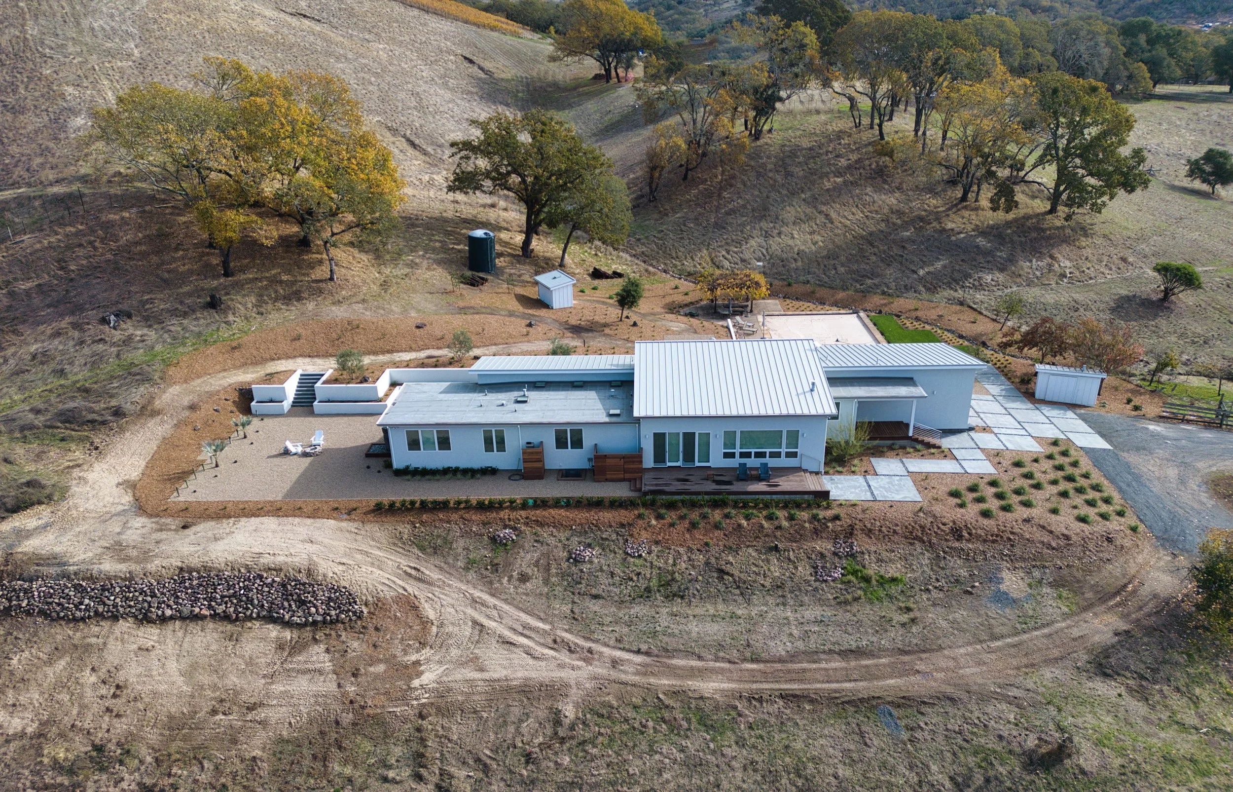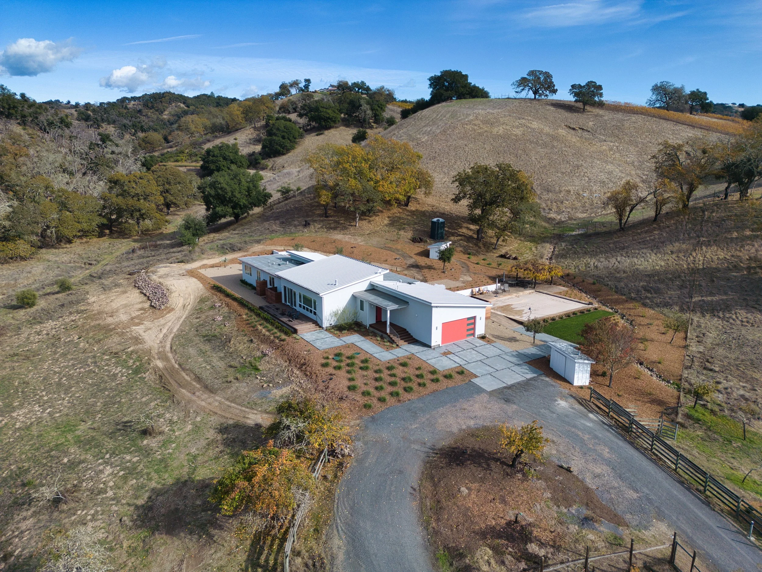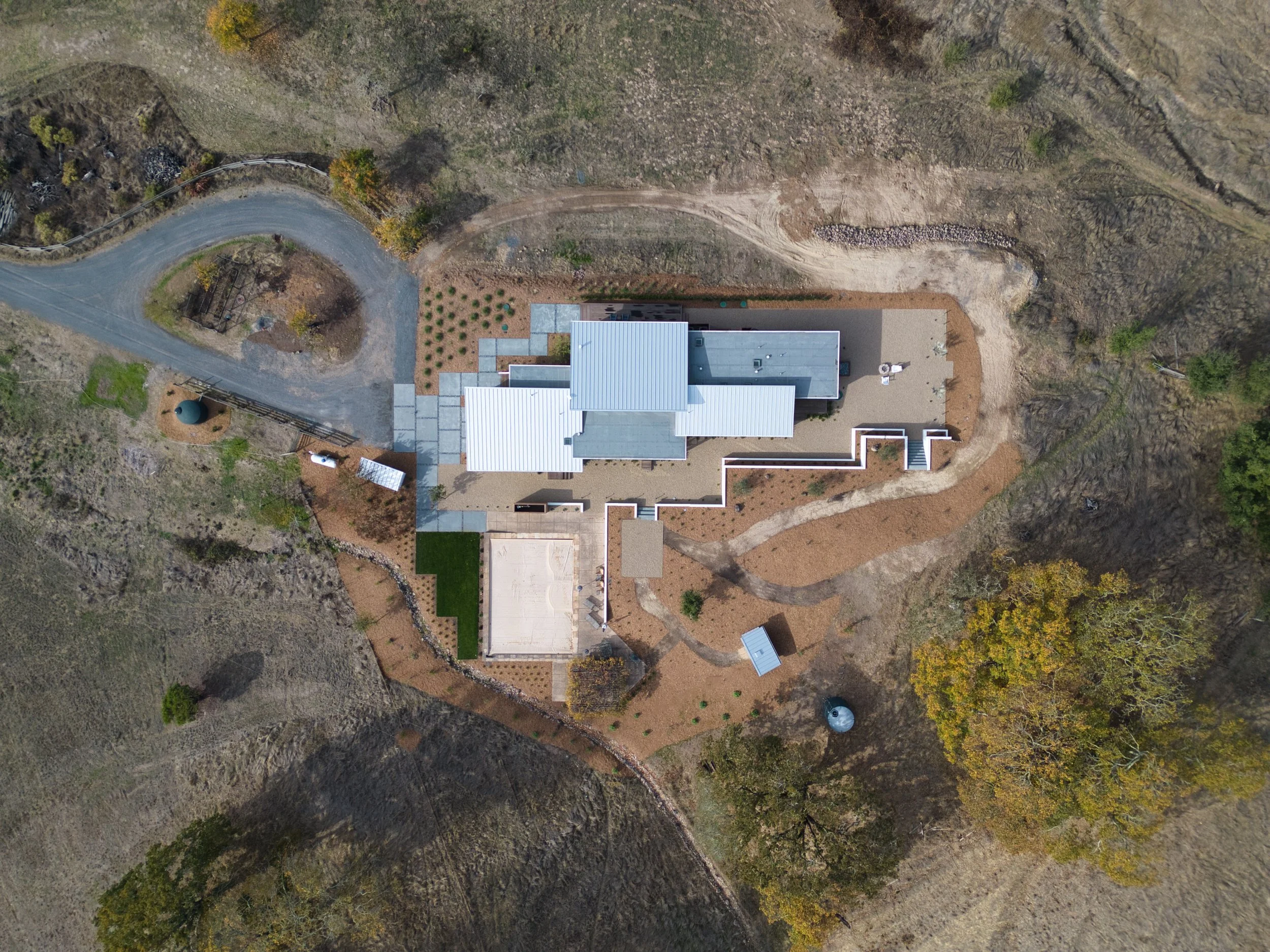The Golden Valley residence is a wildfire rebuild project tastefully designed to embrace its country setting. Highlights include a compact structural design, and east-facing clerestory windows running the entire length of the living, dining, and kitchen areas.