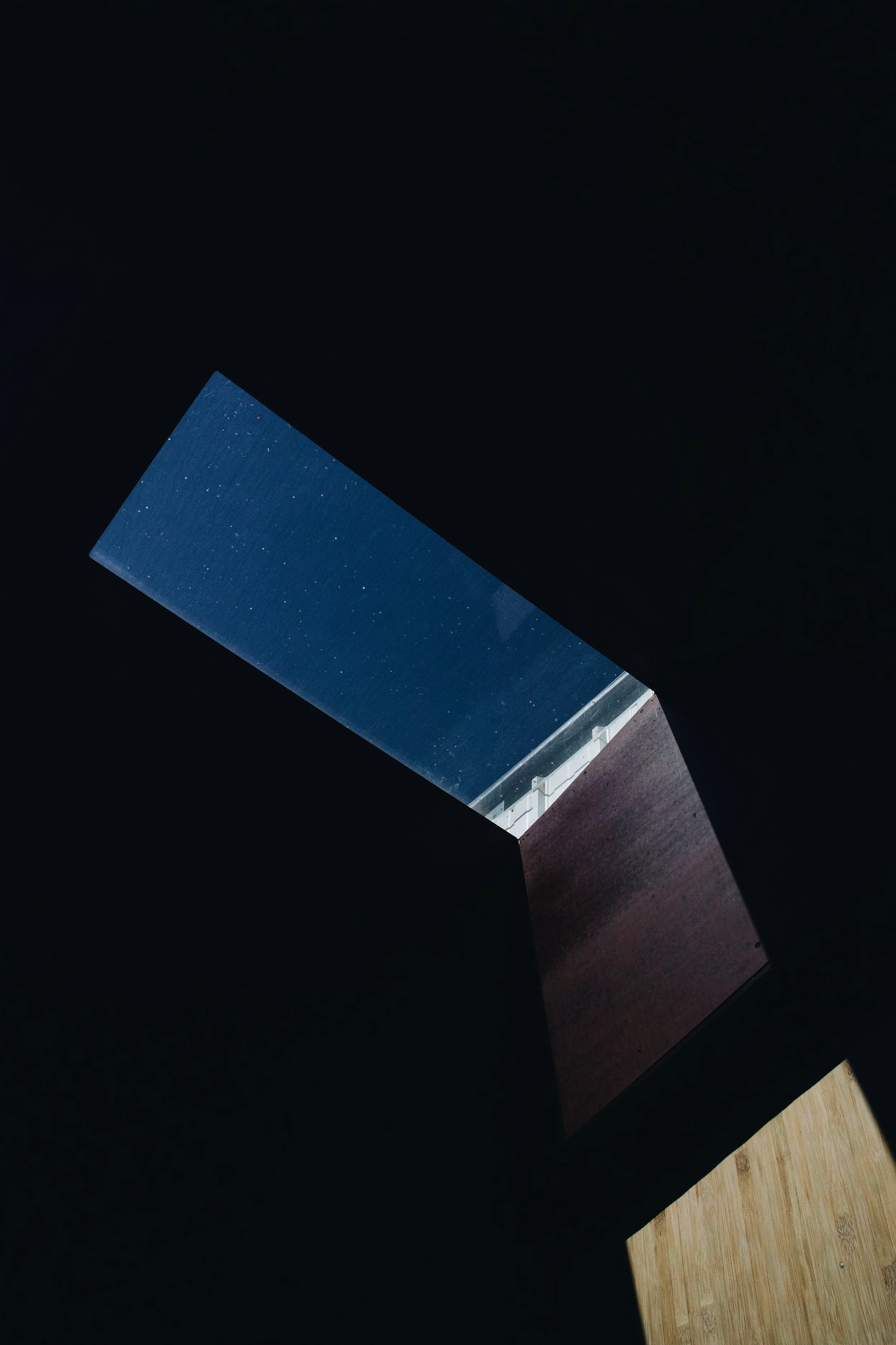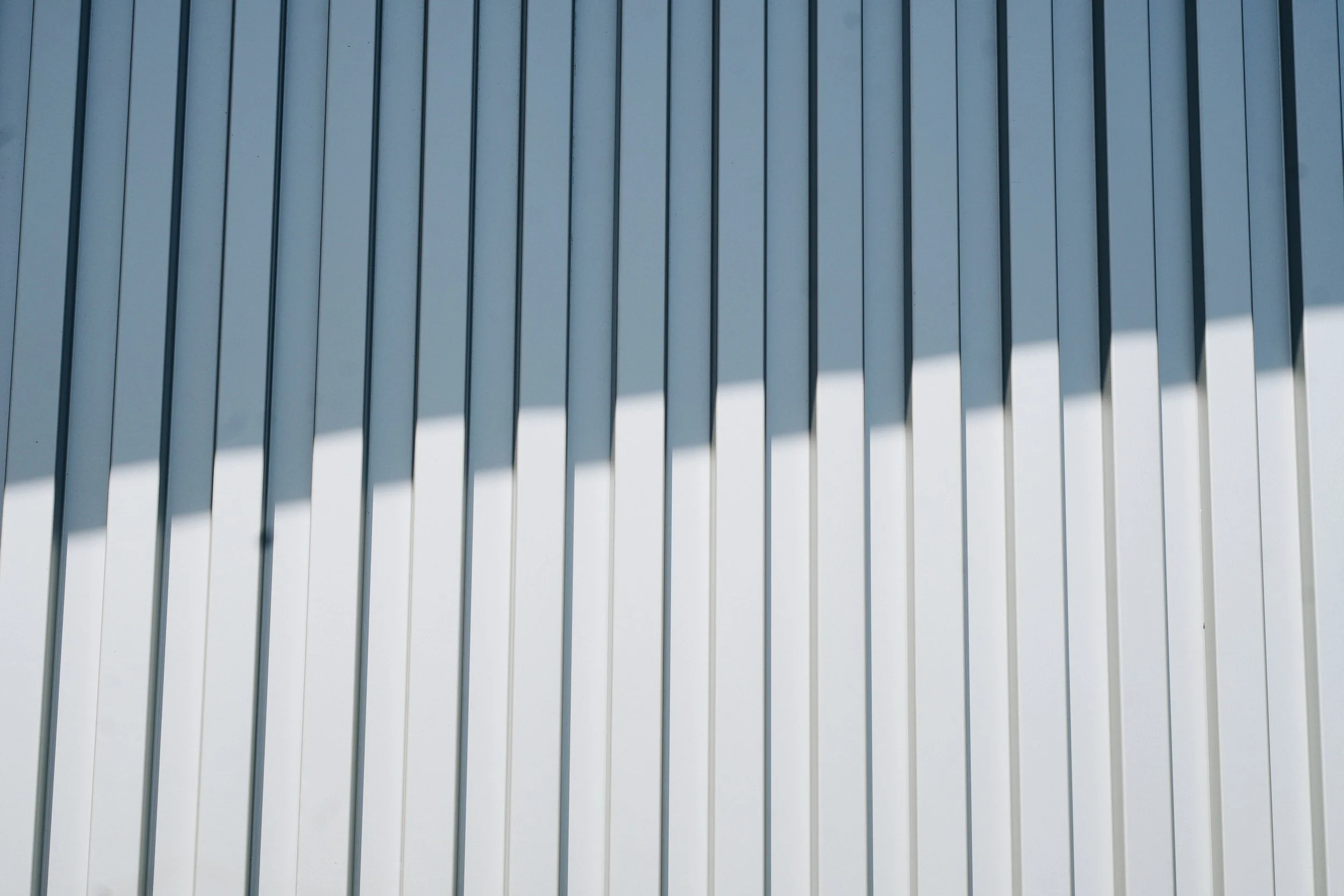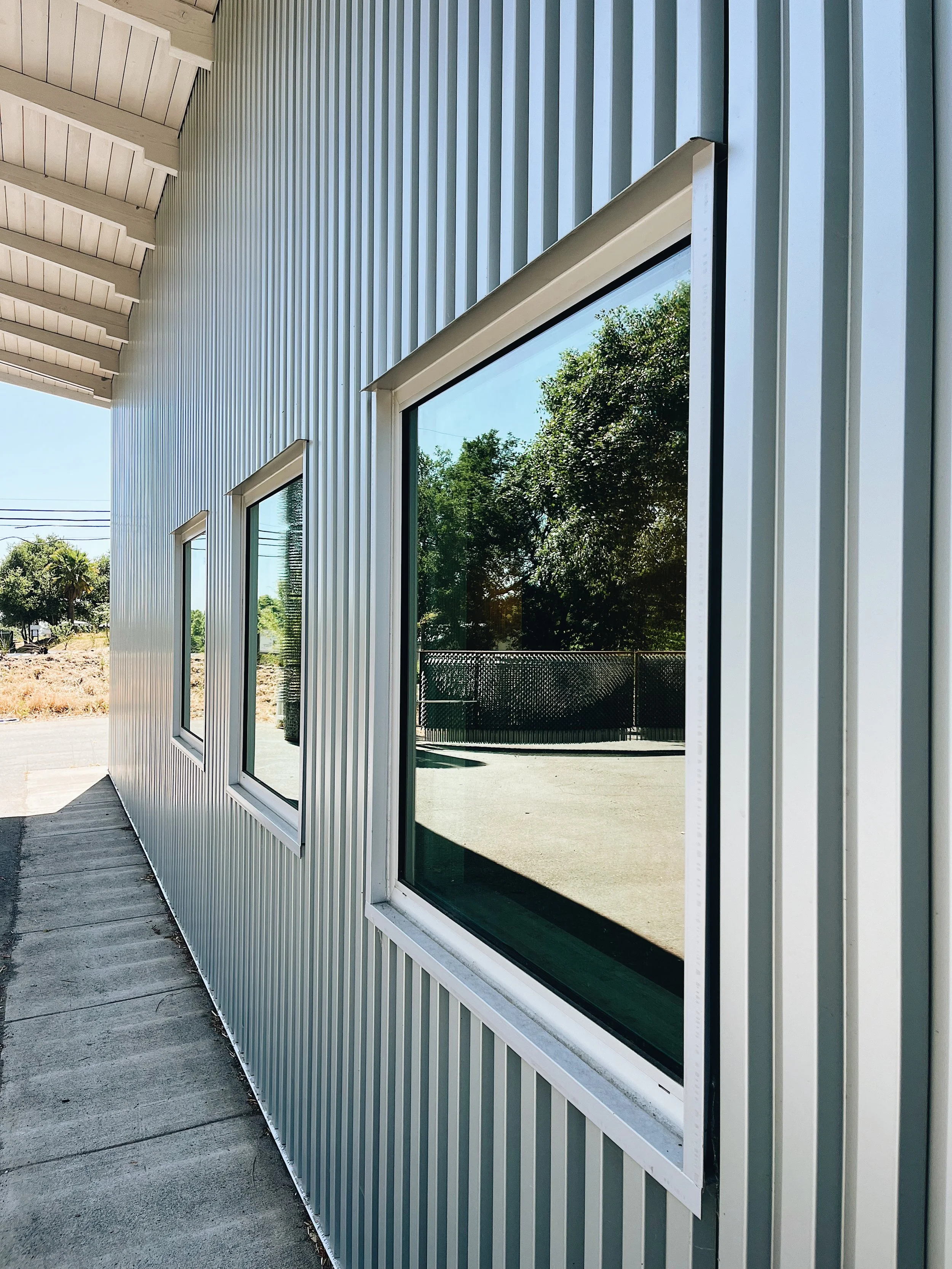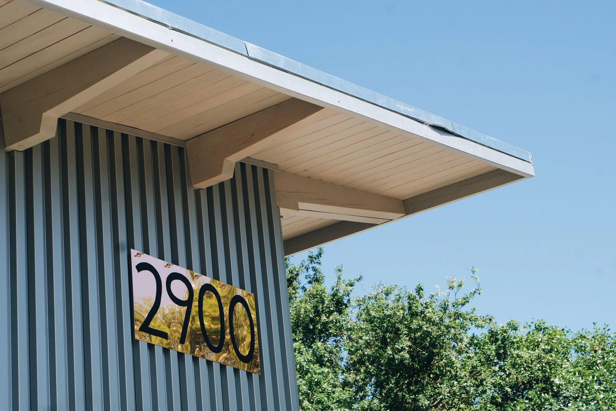 Sloping roof design with shaped eave beams. The studio address plate is attached to metal exterior wall and features copper detailing.