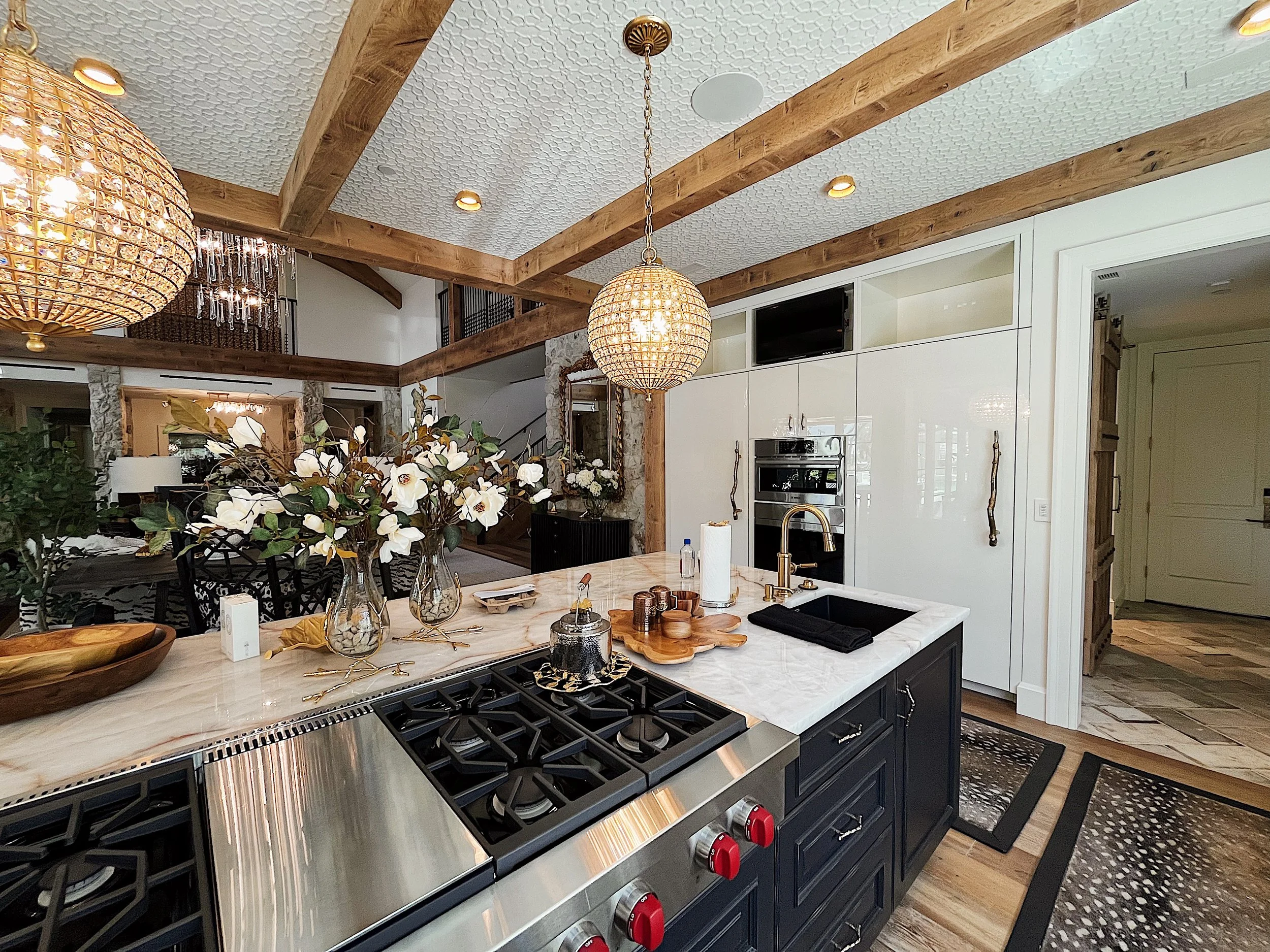 Modern kitchen with white cabinetry, black lower cabinets, a marble countertop, and a stainless steel stove with red knobs. Decor includes vases with white flowers, wooden trays, and black dish towels. Light fixtures include a large basket pendant light and crystal chandeliers. Wooden beams run across the ceiling, and there is a doorway to a hallway in the background.
